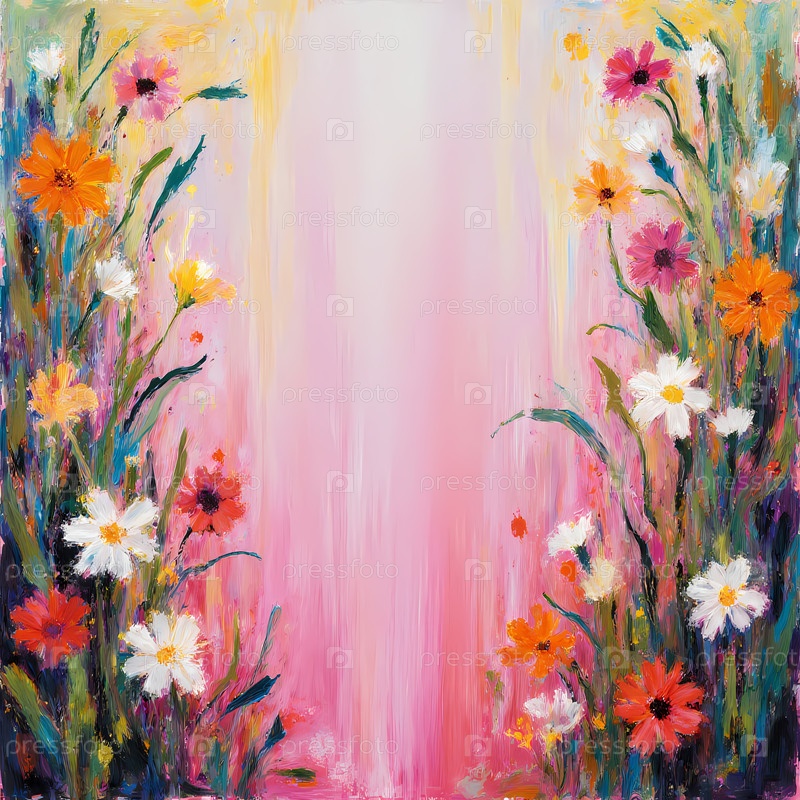Яркие дикорастущие цветы в оранжевых, желтых и белых оттенках создают потрясающую сцену, радостно смешиваясь с мягким розовым фоном, который вызывает тепло и спокойствие Generative AI