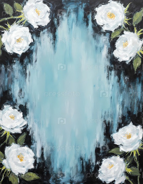 Нежные белые розы грациозно окружают безмятежный синий фон, обеспечивая очаровательное пространство для личных записок, приветствий или приглашений