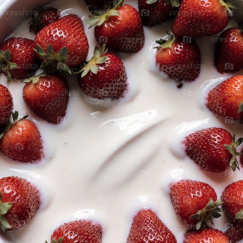 Кремный клубниковый йогурт красиво украшен толстыми ягодами, создавая современное угощение.Солнечный свет наполняет уютную кухню, улучшая ароматы Generative AI