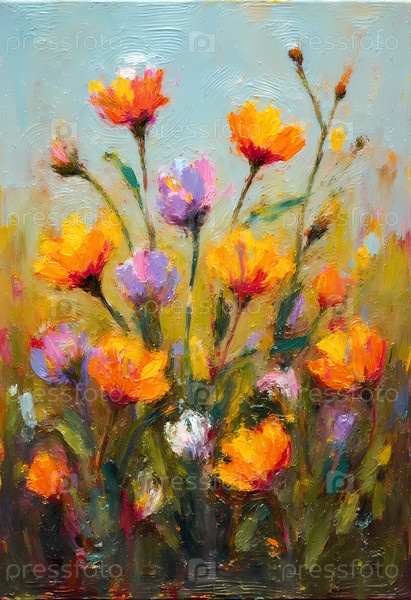 Полотно блестит живописными дикими цветами, их листья сияют оранжевыми и фиолетовыми оттенками, мягко раскачиваясь под теплым солнечным светом, создавая радостную и приглашающую сцену Generative AI