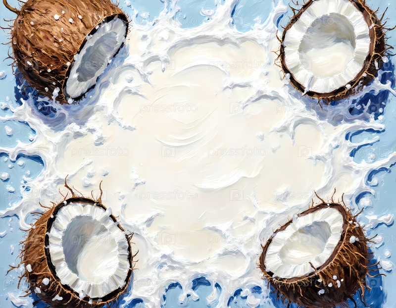 Открытые кокосы окружают брызги сливочного кокосового молока на ярко-синем фоне.Сцена захватывает суть тропического освежения и летнего наслаждения Generative AI