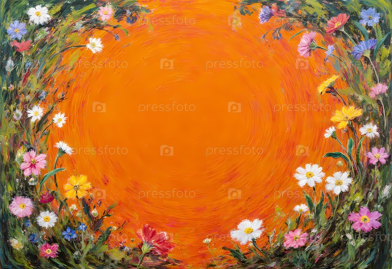 Красочные дикие цветы танцуют вдоль краев, создавая живую границу вокруг освещенного солнцем желтого холста.Эта радостная сцена озаряет любую комнату или открытку Генеративный ИИ