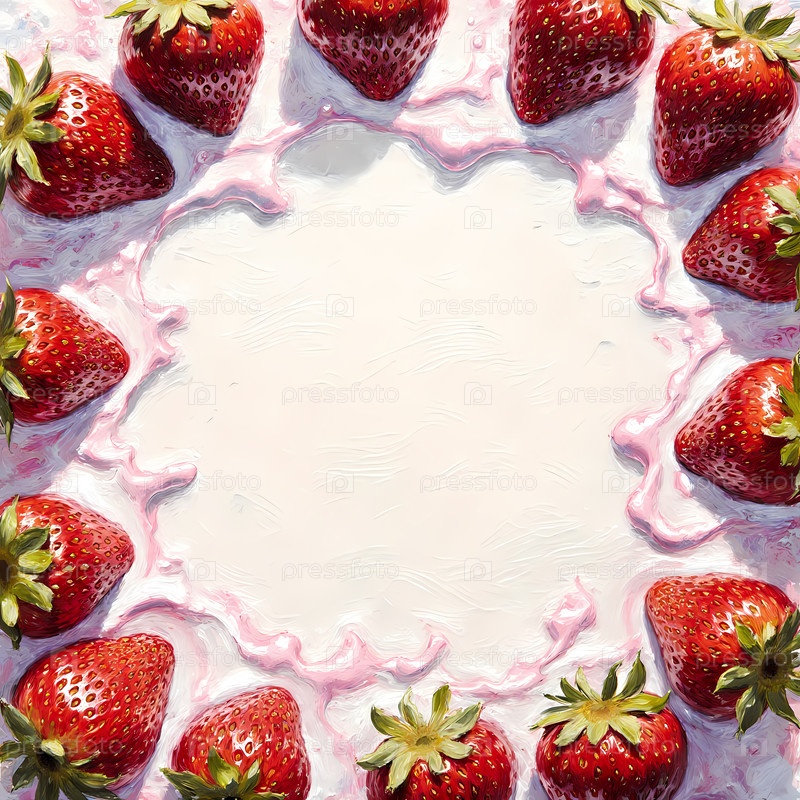 Ярко-красные клубники окружают кремовый йогурт в вкусном дисплее, приглашая вас насладиться освежающим сладким деликатесом, который захватывает суть лета Generative AI