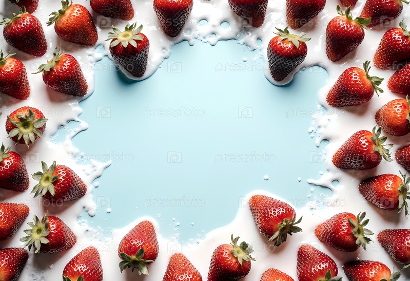 Свежие спелые клубники изящно обрамляют миску кремообразного клубничного йогурта на светло-синей поверхности, приглашая момент сладкого удовольствия и радости Generative AI