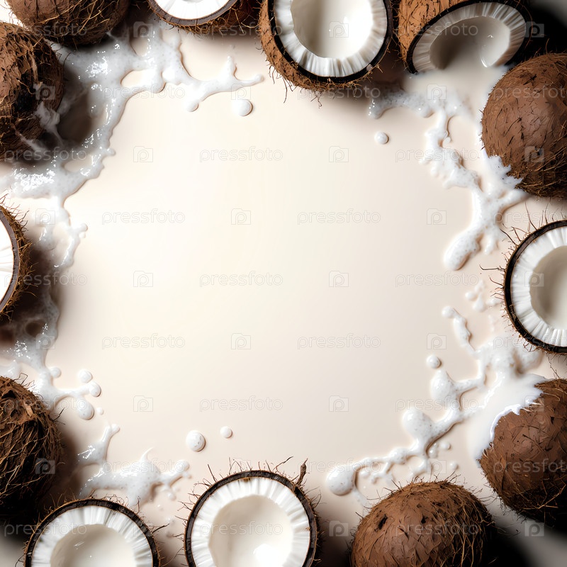 Свежие кокосовые орехи лежат разбросаны, их скорлупы порваны и открыты с ароматным кокосовым молоком вокруг них, создавая успокаивающую тропическую сцену, идеально подходящую для кулинарного вдохновения