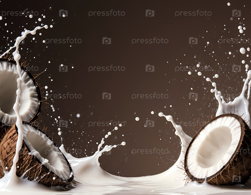 В причудливой экспозиции из треснувших раковин падает сливочное кокосовое молоко, создавая живое пленение на мягком темном фоне и захватывая освежающую сущность природы Generative AI