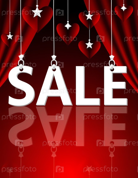 Яркие буквы означают "продажа" на богатом красном фоне, окруженные сердцами и звездами, создавая яркое настроение, идеально подходит для покупок и праздников Generative AI