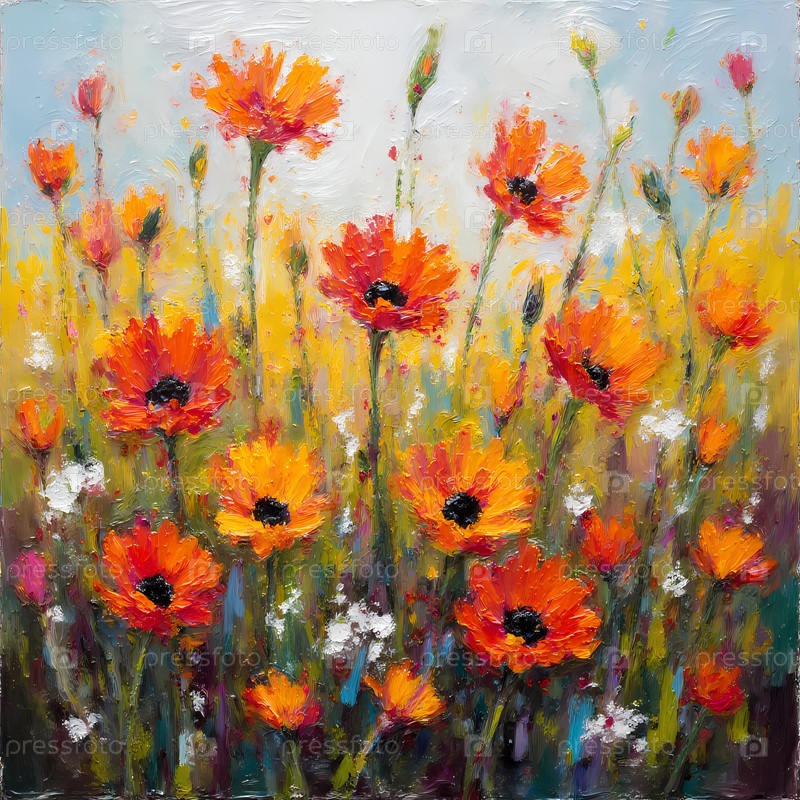 На яркой и солнечной лужайке цветут живописные дикие цветы с огненными оттенками оранжевого и желтого.Нежный бриз несет в себе их радостную сущность, приглашая к спокойствию и удивлению Generative AI