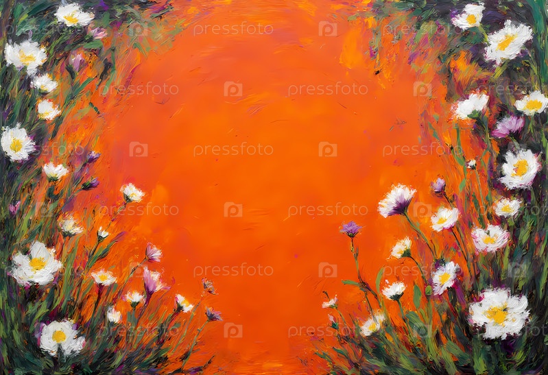 Живое изображение диких цветов в белых и фиолетовых цветах танцует по краям.Жестокий оранжевый фон излучает тепло, создавая чувство радости и спокойствия Generative AI