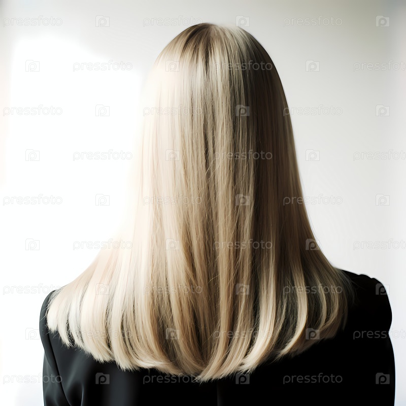 Фигура в элегантном черном наряде стоит, демонстрируя гладкие блондинки с прямыми волосами, которые идеально каскадируют по спине, создавая спокойную и художественную атмосферу в чистом ярком пространстве Generative AI