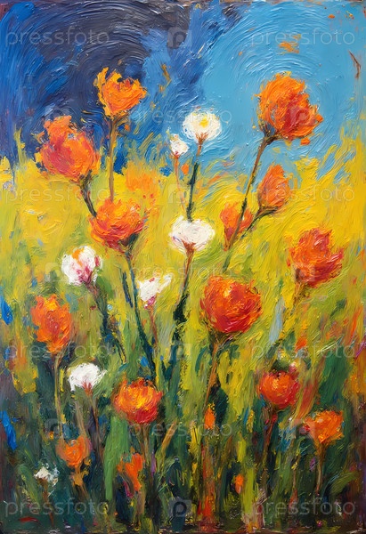 На оживленной лужайке цветут дикие цветы в ярких оттенках оранжевого и белого, тянутся к теплому солнцу на фоне голубого неба и золотых полей, создавая радостную сцену Generative AI