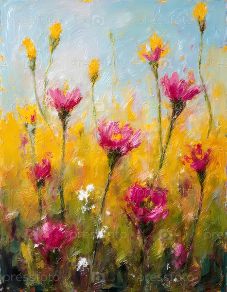 Яркое сочетание розовых и желтых диких цветов заполняет луг, мягко раскачиваясь под теплым солнцем.Голубое небо добавляет спокойный фон к этой радостной сцене природы Generative AI