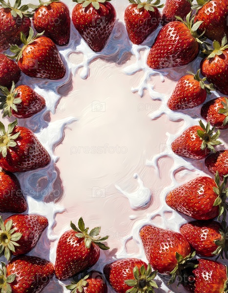 Вихри вкусного йогурта смешиваются с спелыми клубниками, создавая восхитительное визуальное удовольствие.Светло-красные ягоды окружают кремообразную основу, приглашая нас попробовать свежесть Generative AI