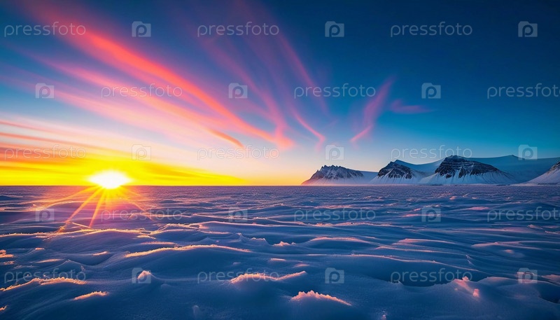 Спокойный арктический ландшафт тундры покрыт морозом при восходе солнца, излучая золотистый свет над ледяной местностью и освещая тонкие образования льда