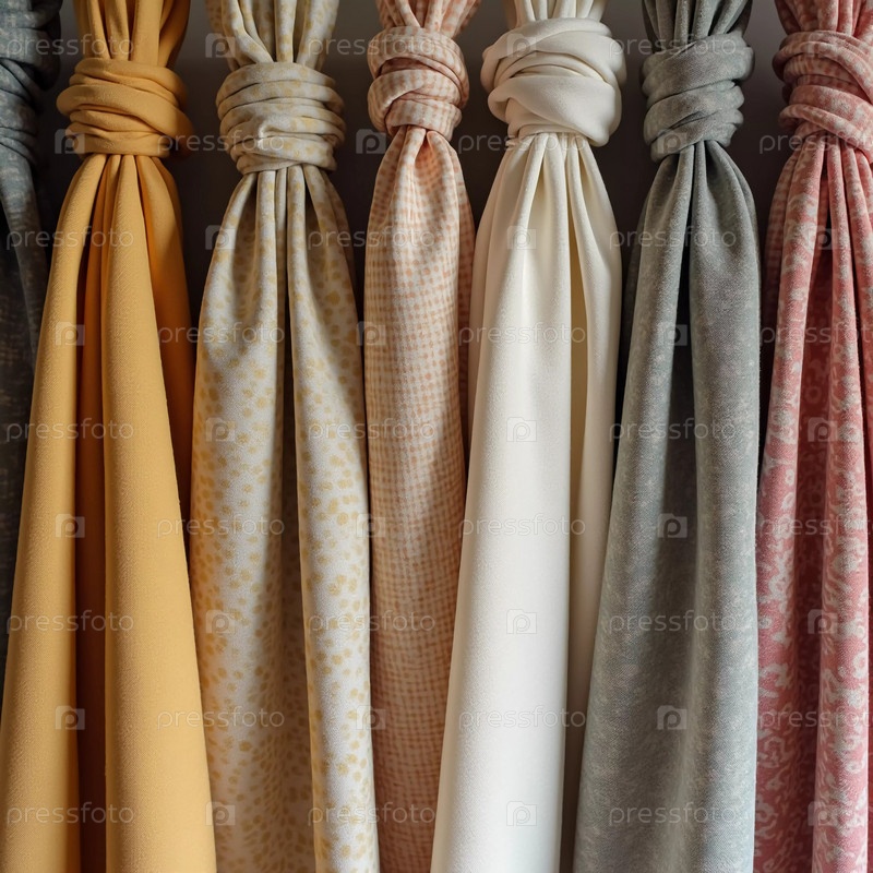 Сложно связанные занавесные узлы грациозно висят в текстильном магазине, демонстрируя яркий массив цветов, узоров и текстур при дневном свете