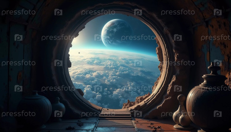 Наблюдение за планетой Земля через люк открывает захватывающий вид на покрытые снегом горы, спокойные океаны и рассеянные облака, подчеркивая красоту планеты сверху