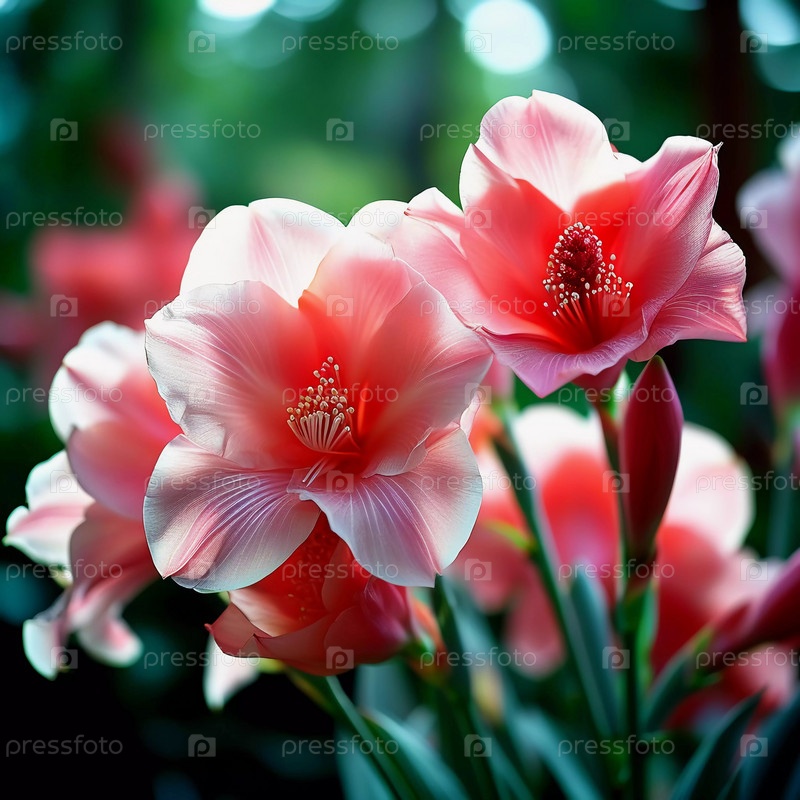 Кластеры потрясающих мечлилий демонстрируют свои яркие розовые, персиковые и сливочные лепестки, привлекая опылителей в спокойной садовой обстановке при мягком свете рассвета