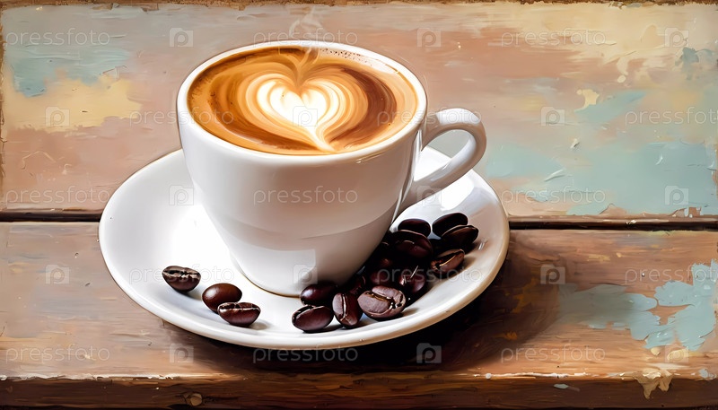 Теплый эспрессо-кофе подается в очаровательной белой чашке с дизайном сердца, на тарелке из кофейных зерен над винтажным деревянным столом в уютной атмосфере. ретро рисует стилизованную картину. генеративный AI