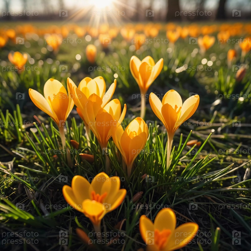 Нежные желтые цветы крокуса расцветают в пышной зеленой траве, солнечный свет в тихой весенней обстановке Возрождение природы Шафран Крокус - род многолетних луковичных травных растений семейства Iris Iridaceae
