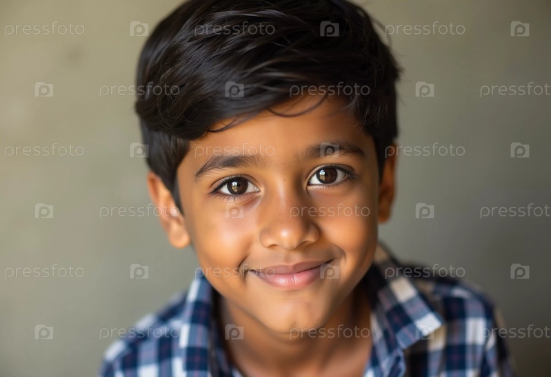 Веселый мальчик, проживающий в Индии, блестит теплой улыбкой, демонстрируя свои яркие глаза и игривый дух внутри дома