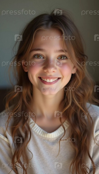 Молодая белая девушка с красивыми карими глазами и волнистыми волосами стоит, мягко улыбаясь.Ее игривое поведение просветляется, когда она позирует в уютной обстановке во Франции.Генеративный ИИ