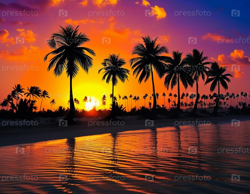 Величественные пальмы высоко стоят на фоне потрясающего заката неба, заполненного теплыми оранжевыми и фиолетовыми оттенками. Спокойные воды отражают яркую сцену, вызывая чувство спокойствия Generative AI