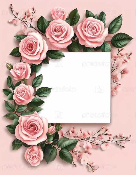 Мягкие розовые розы с пышными зелеными листьями окружают пустое пространство, приглашая идеи для личных заметок или художественных творений, излучающих нежную элегантность и тепло