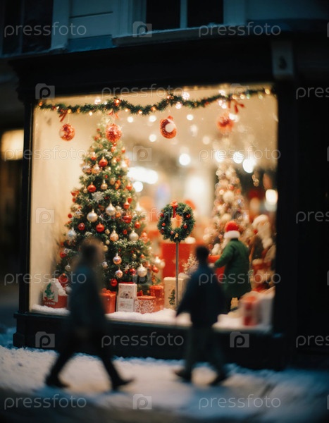 Люди проходят мимо красиво украшенного витрины с рождественскими деревьями, орнаментами и праздничными фигурами. Сцена отражает радость и дух сезона каникул. Эффект смещения наклонов. Генеративный ИИ