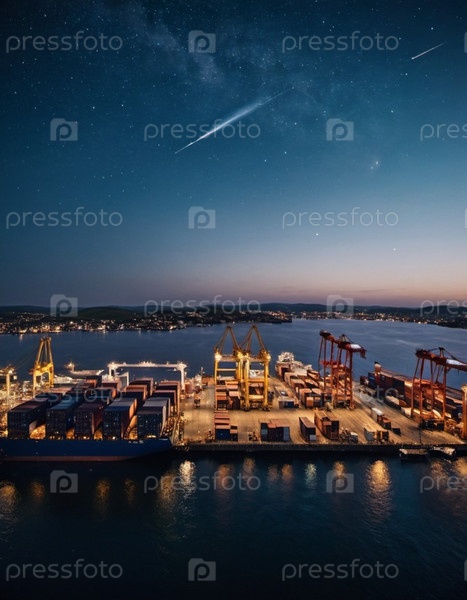 Док оживает на закате с ярким сочетанием судовых контейнеров и освещенных кранов, работающих на темном фоне