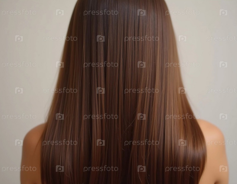 Гладкие, прямые коричневые волосы элегантно протекают вниз по спине, подчеркивая его здоровый блеск и равномерный цвет, освещенные мягким освещением, создавая поразительный вид