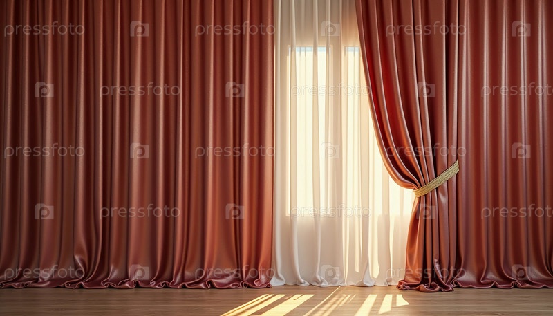 Элегантно оформленные шелковые шторы в теплых оттенках дополняют естественный свет, поступающий в комнату Generative AI