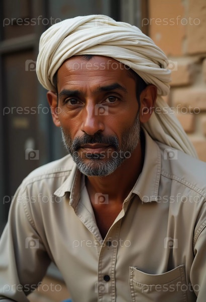 Молодой йеменский мужчина, одетый в традиционный платок, смотрит прямо на него, его выражение лица показывает смесь созерцания и силы Generative AI