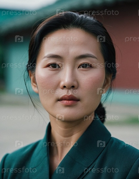 Женщина средних лет из Северной Кореи стоит на улице, ее серьезное выражение лица отражает окружающую среду.Она одета в традиционную одежду, а за фоном видна толпа
