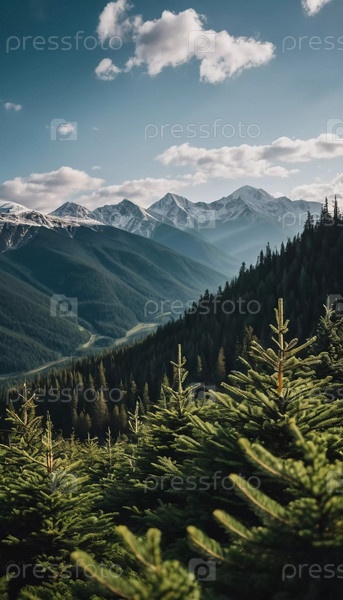 Величественные горы возвышаются над безмятежным пихтовым лесом под драматическим небом, демонстрируя красоту природы на закате