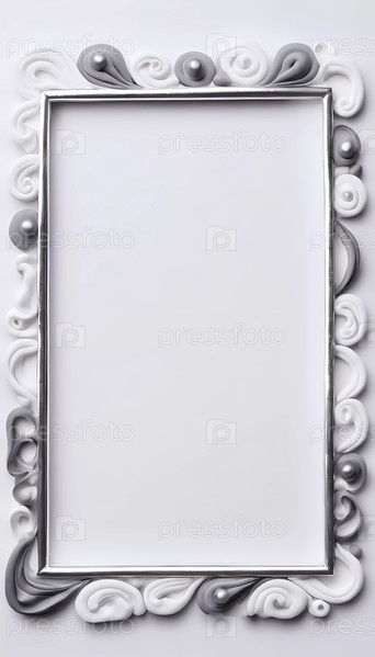Декоративная рама с украшенными вихрями и жемчужинами в серебряных и белых тонах красиво настроена на мягкий серый фон, идеально подходит для отображения произведений искусства или фотографий
