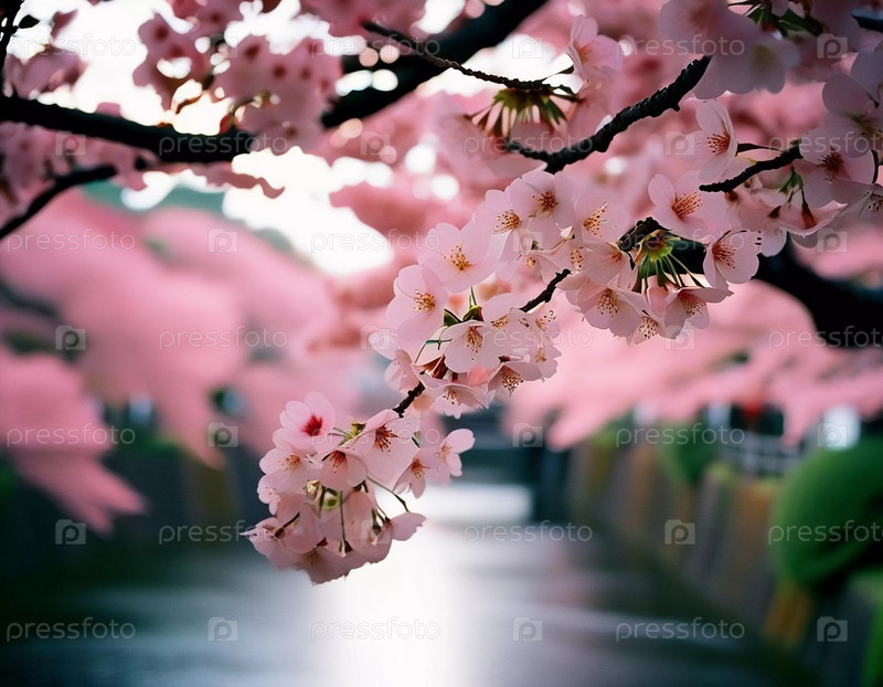 Нежные розовые вишневые цветки красиво цветут на ветке дерева во время весеннего сезона, заполняя сцену яркими цветами и ощущением обновления в природе