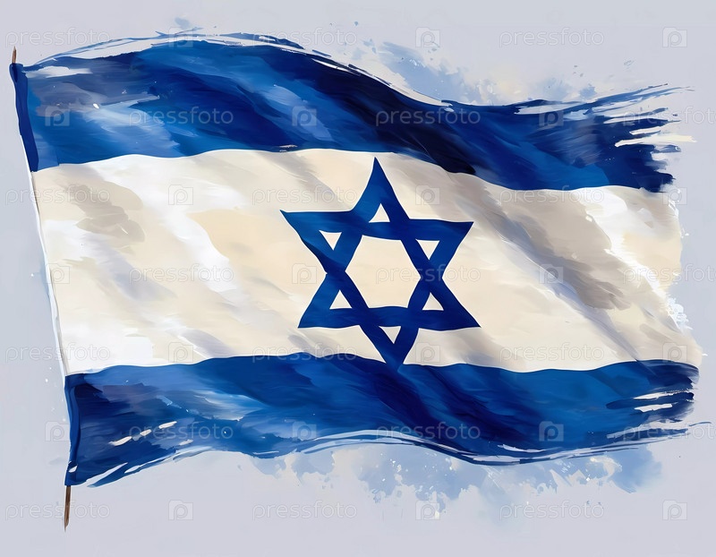 Рисунок израильского флага. Машущий на ветре, с синими и белыми полосами и звездой Давида в центре. Эффекты брызги вокруг флага, создающие ощущение движения и энергии. ИИ генерируется