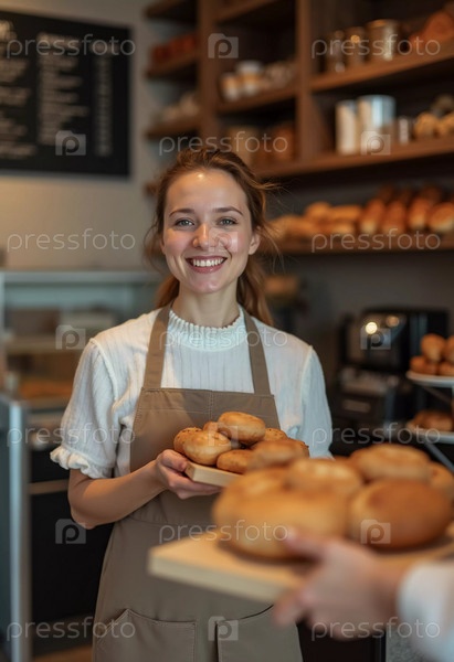 Улыбающийся пекарь держит теплый, хрустящий хлеб в очаровательной пекарне, наполненной различными продуктами для выпечки