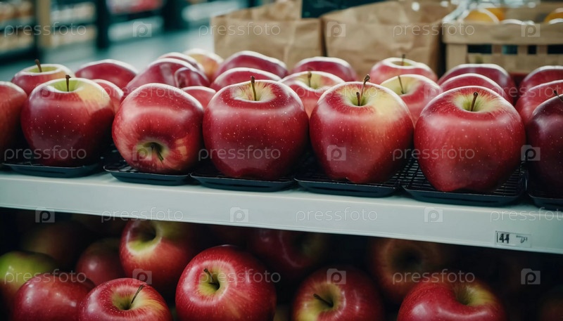 Красочный ассортимент красных яблок аккуратно расположен на прилавке супермаркета, приглашая клиентов исследовать и выбрать свежие фрукты