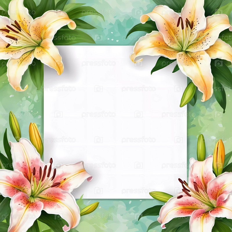 Красивая цветовая граница демонстрирует элегантные белые и розовые лилии, окруженные пышным зеленым лиственницей, создавая идеальное пространство для пользовательских сообщений или приглашений