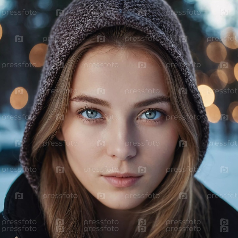 Молодая женщина стоит в снегу, ее увлекательные голубые глаза контрастируют с ее темной капюшоном.Мягкий вечерний свет освещает фон, создавая спокойную и очаровательную атмосферу