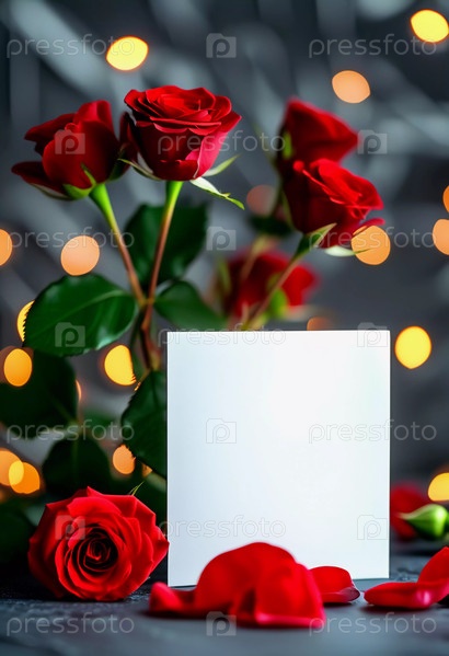 Красиво устроенный набор красных роз окружает пустую карточку, идеально подходящую для выражения романтических чувств