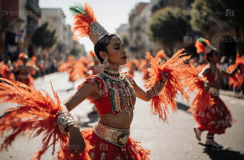 Красивая мексиканская танцовщица карнавала демонстрирует яркую традицию с красочными костюмами во время оживленных уличных торжеств в солнечной обстановке