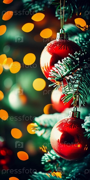 Сверкающие орнаментальные шары в ярко красном и золотом цветах висят на ветке пышной ель. Мягкие теплые огни мерцают, улучшая праздничный дух Рождества. С Новым годом. Анаморфический боке. Генеративный ИИ