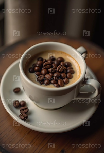 Чашка с эспрессо опирается на деревянный стол, окруженный богатыми кофейными зернами, что вызывает теплую и гостеприимную обстановку, идеально подходящую для наслаждения тихим моментом