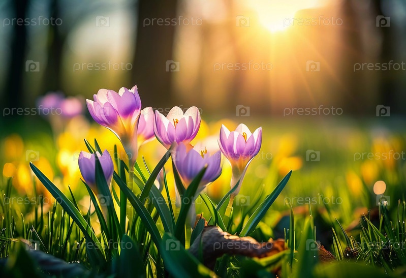 Нежные розовые цветы крокуса расцветают в пышной зеленой траве, солнечный свет в тихой весенней обстановке. Возрождение природы. Шафран Крокус - род многолетних луковичных травных растений семейства Ирис Iridaceae