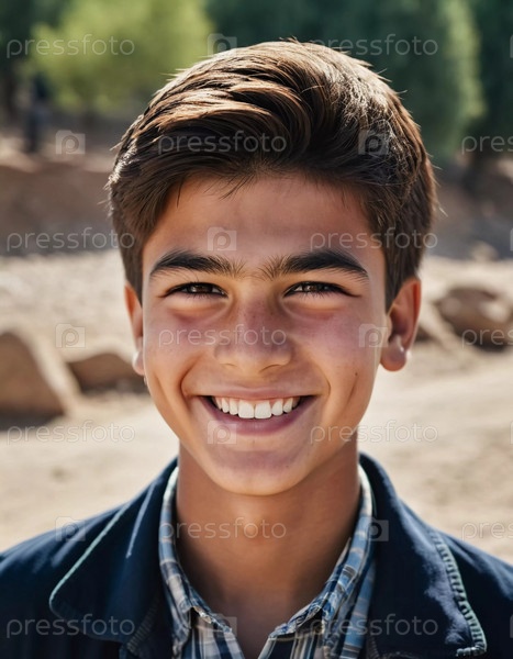 Веселый милый таджикский мальчик 18 лет сияет от счастья, когда он стоит в живописном пейзаже, окруженный красотой природы во время теплого золотого часа света. Счастливый улыбающийся брюнетки парень. ИИ генерируется