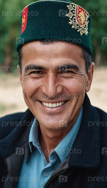 Веселый 45-летний таджикский мужчина в традиционной одежде с яркой улыбкой на потрясающем фоне, излучающий тепло и счастье