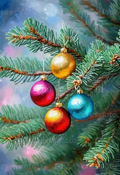 Красочные рождественские украшения украшают ветви пихты, яркие шары в оттенках красного, синего, золотого и розового цветов, воплощающие праздничное настроение зимой