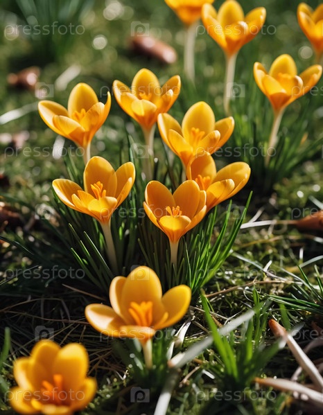 Нежные желтые цветы крокуса расцветают в пышной зеленой траве, солнечный свет в тихой весенней обстановке Возрождение природы Шафран Крокус - род многолетних луковичных травных растений семейства Iris Iridaceae